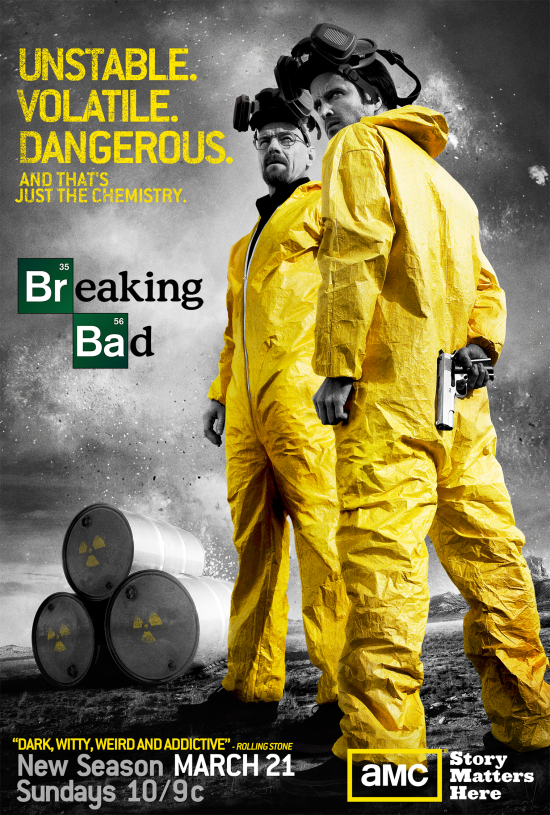 If you’ve got your finger on the pulse of entertainment buzz you should already know of, and be avidly watching, AMC’s first breakout original progam Mad Men. I would like to now boldly declare that cool cat Don Draper isn’t the only compelling character ruling the airwaves – he’s got stiff competition in the form of  an Albuquerque  high school chemistry teacher. “Wha, wha, what?” you may be asking yourself. Stay with me, there’s more to the story. This particular teacher shaping young minds by day has a moonlighting gig: cooking and dealing crystal meth. Meet the shades-of-grey “hero” of Breaking Bad, Walter White.